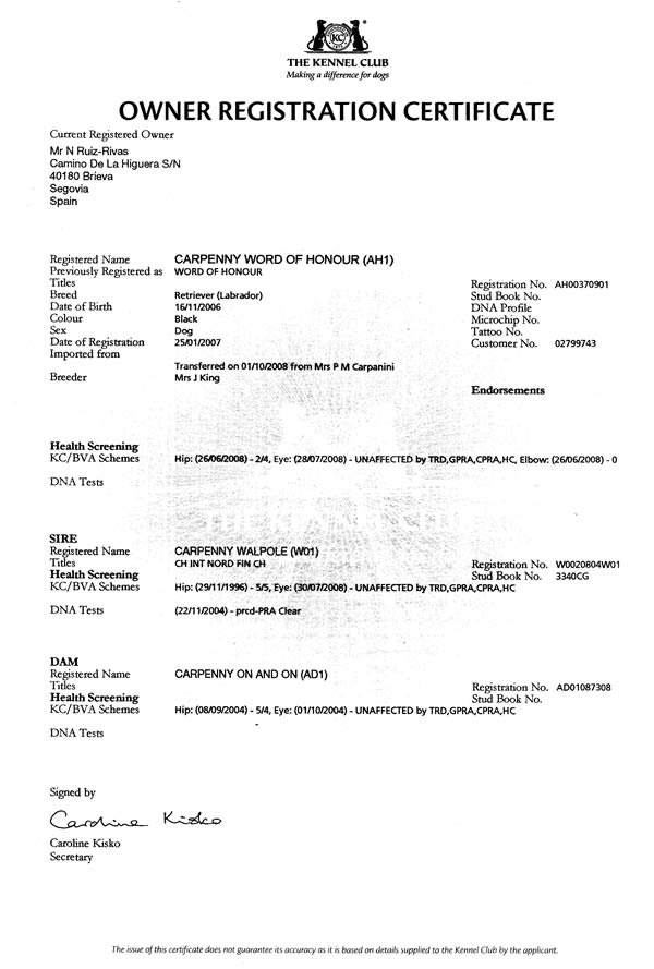 Para todos los que estén interesados, y dado que hay gente que no se cree que el perro Carpenny Word of Honour fuera mío antes de la exposiciones Monográfica de Labradores, y de la Internacional de Bilbao, adjunto el Certificado de Propiedad del Kennel Club Inglés, que demuestra que el perro era mío con fecha 1 de Octubre del 2008.